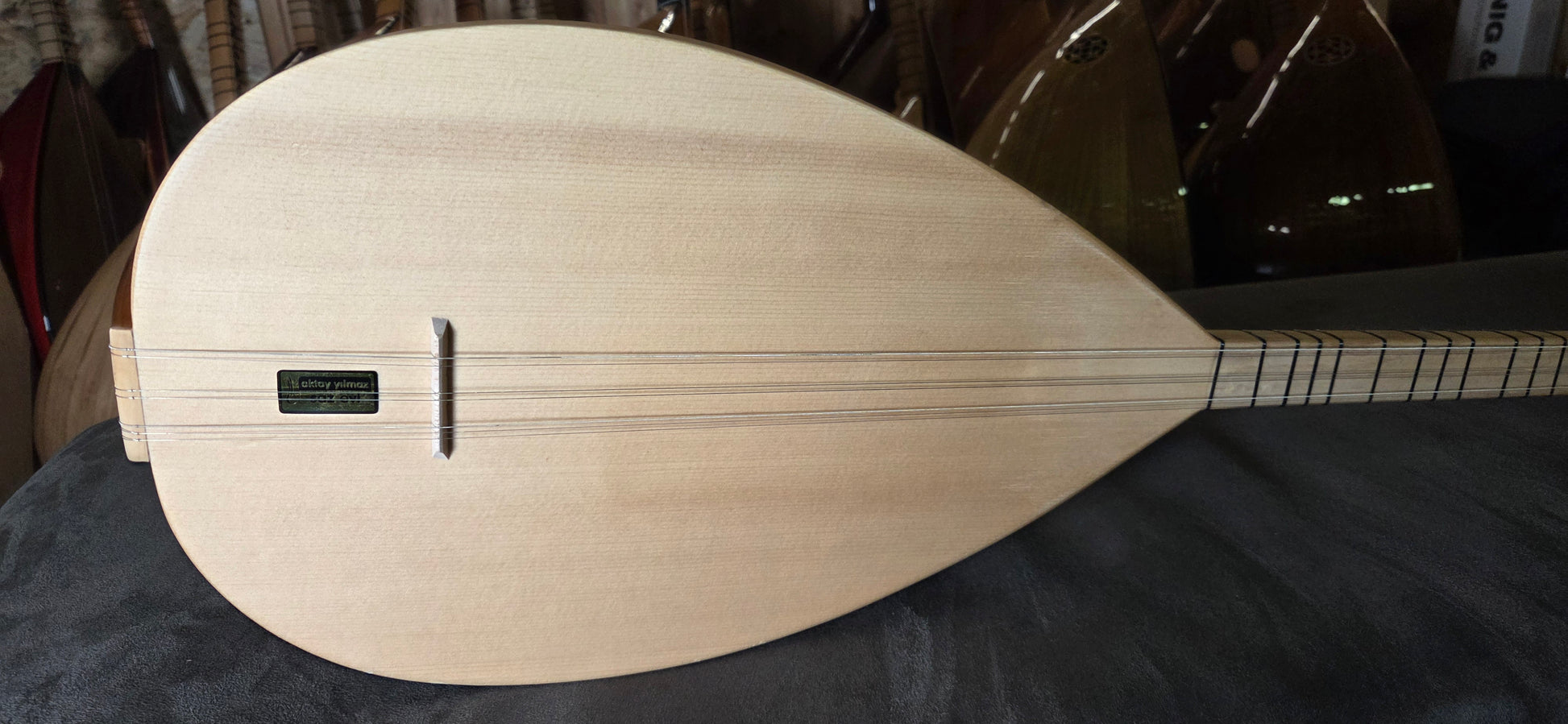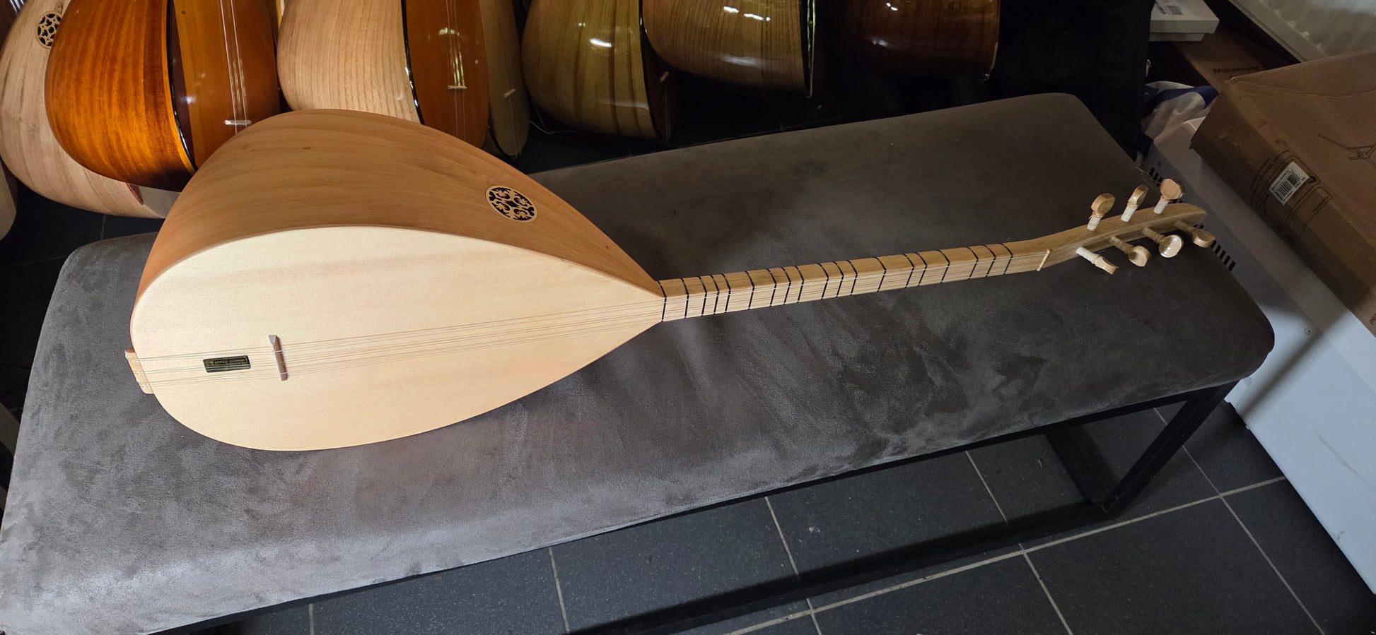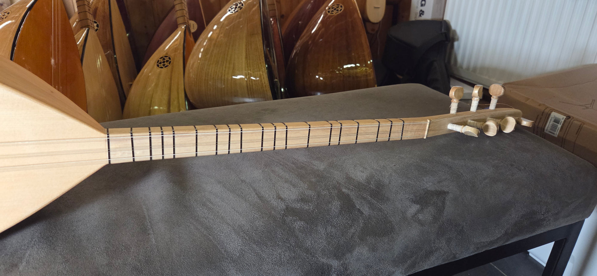 Een saz wordt voor verzending een laatste keer gestemd en gecontroleerd voordat deze wordt ingepakt